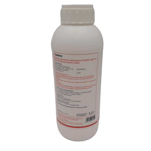 CARATTERISTICHE: L'OPALENE è un olio minerale ad elevata raffinazione. La tecnica di preparazione di questo formulato fa dell'OPALENE un preparato per la lotta contro le cocciniglie senza tema di manifestazioni fitotossiche sulle piante utili. Sugli agrumi può essere impiegato nei seguenti periodi: periodo invernale: dalla raccolta alla pre-fioritura - periodo estivo: da giugno (quando il frutto raggiunge la grossezza di una noce) fino al periodo che precede l'invaiatura. Sui fruttiferi (melo, pero; pesco, albicocco, susino, ciliegio; vite; olivo) e sulle piante ornamentali in pieno campo va impiegato preferibilmente a fine inverno (al rigonfiamento delle gemme) e nel periodo primaverile-estivo al primo apparire delle infestazioni.