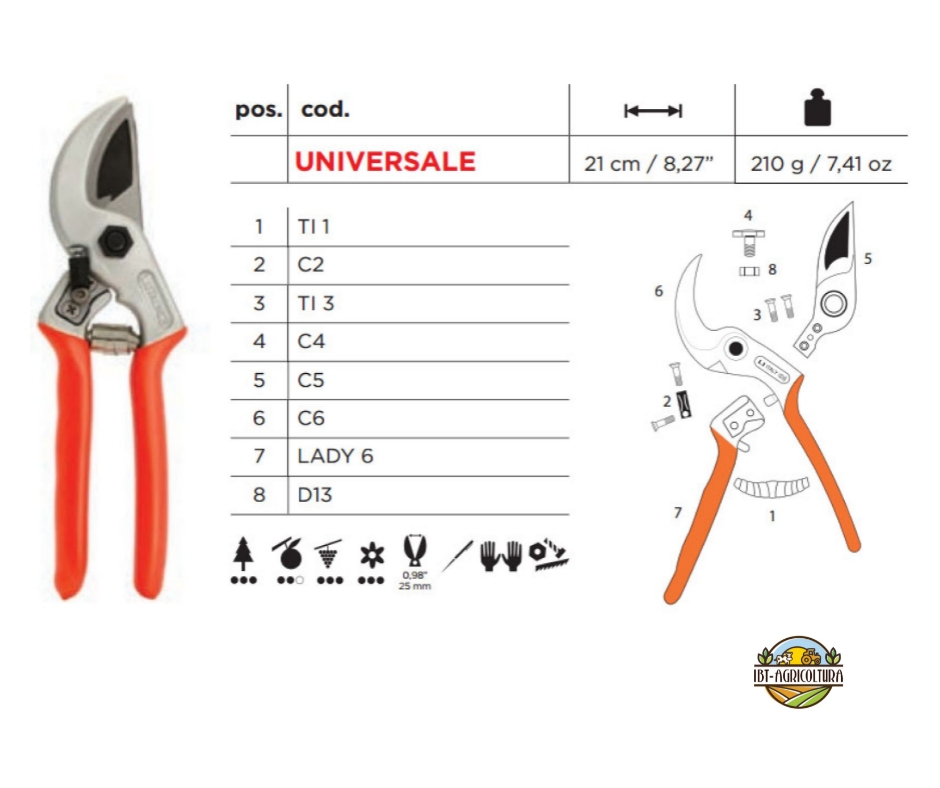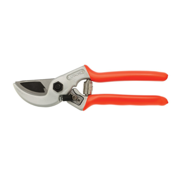 Forbice professionale con battuta curva che permette di trattenere fermo il ramo in fase di taglio evitando il contraccolpo sul polso. L’impugnatura è di tipo universale adatta a destri e mancini. Il manico e la contro-lama in lega di alluminio leggero sono forgiati a caldo, il trattamento superficiale con ossidazione anodica permette una maggiore resistenza nel tempo. La lama in acciaio con alta percentuale di carbonio è forgiata a caldo. L’incavo nella lama diminuisce lo sforzo necessario al taglio perchè aumenta la penetrazione nel ramo. Come tutti gli utensili per la potatura manuale, è completamente intercambiabile e regolabile. Peso : 210 gr. Lunghezza : 210 cm. Apertura max. lama 25 mm