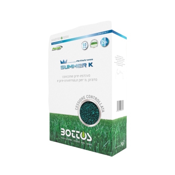 Fertilizzante antistress per tappeti erbosi con 100% di frazione azotata a cessione programmata da POLYON per impiego pre-estivo e preinvernale. Summer K 10-0-30 è un fertilizzante specifico per tappeti erbosi con frazione azotata completamente a cessione programmata e una frazione potassica tutta di derivazione da Solfato. Il Potassio ha funzioni di antistress estivo, grazie alla sua azione di irrobustimento sui tessuti vegetali, conferendo alla vegetazione maggiore tolleranza ai principali stress (siccità, calpestio, caldo, ecc.). La frazione azotata, tutta ricoperta da Polyon, facilita il suo impiego nei periodi caldi, evitando le crescite d’urto e la suscettibilità alle malattie fungine. Il Polyon cede nell’arco di 90 gg le 10 unità di Azoto in maniera costante senza picchi di crescita. Summer K 10-0-30 è indicato per concimazioni pre-estive e preinvernali. Con il 100 % di N a cessione programmata da Polyon.