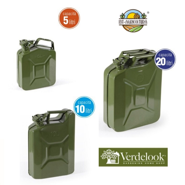 Tanica in metallo adatta per tutti i carburanti liquidi e senza piombo. Omologata a norma UN. Colore verde. Capacità 10 litri