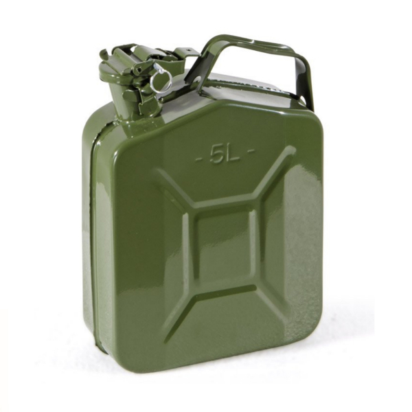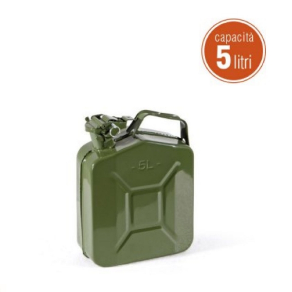 Tanica in metallo adatta per tutti i carburanti liquidi e senza piombo. Omologata a norma UN. Colore verde. Capacità 5 litri.