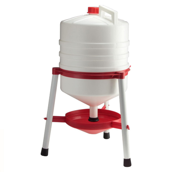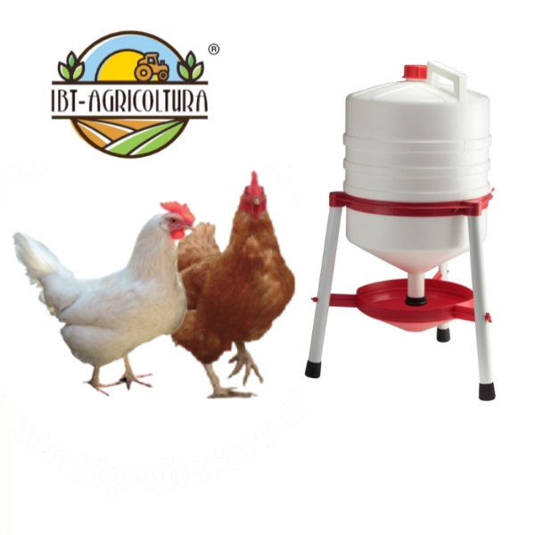 Abbeveratoio a livello costante per polli e galline , capacità 30 litri , ingombro diametro 48 cm , pratico tappo superiore per riempire il serbatoio di acqua , vaschetta inferiore removibile per facile pulizia.