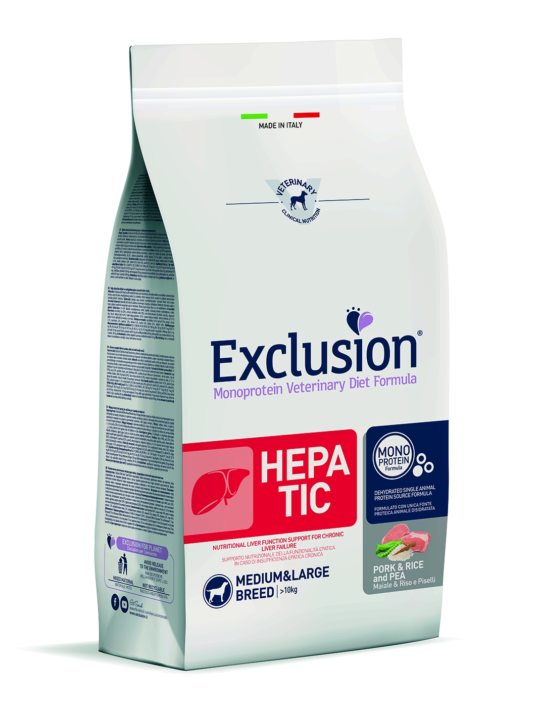 Exclusion Monoprotein Veterinary Diet Formula Hepatic è un alimento dietetico con formulazione monoproteica, realizzato con un’unica fonte alternativa di proteine animali, ingredienti innovativi e preservato con tocoferoli naturali; rappresenta la risposta nutrizionale a disposizione del Veterinario, differenziata per taglia, come supporto nutrizionale della funzionalità epatica in caso di insufficienza epatica cronica e per la riduzione del rame nel fegato.