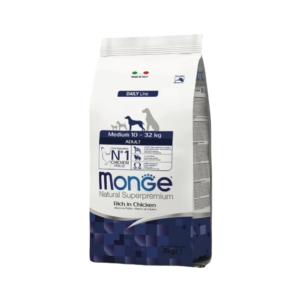 Monge Natural Superpremium Medium Senior Ricco in Pollo è un alimento completo per cani adulti anziani di taglia media (10-32 kg). Specificamente sviluppato pensando al benessere del tuo cane, grazie alla presenza di sostanze nutritive di qualità frutto della ricerca Made in Italy. Il primo ingrediente è il pollo e la formulazione è caratterizzata da digeribilità e appetibilità grazie all’inclusione di carne fresca. La ricetta è arricchita con prebiotici di ultima generazione xilo-oligosaccaridi (XOS) per il supporto del benessere intestinale. La formulazione contiene inoltre glucosamina e solfato di condroitina per il supporto delle articolazioni e delle ossa e L-carnitina per il mantenimento della massa muscolare. Senza coloranti e conservanti artificiali aggiunti.