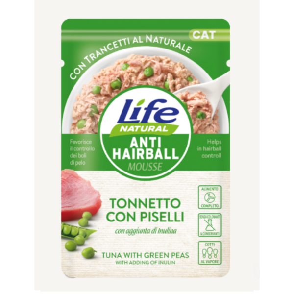Cibo umido in mousse Life Natural per gatto contro la formazione delle palle di pelo con trancetti al naturale di tonnetto e piselli . Bustina da 70 gr