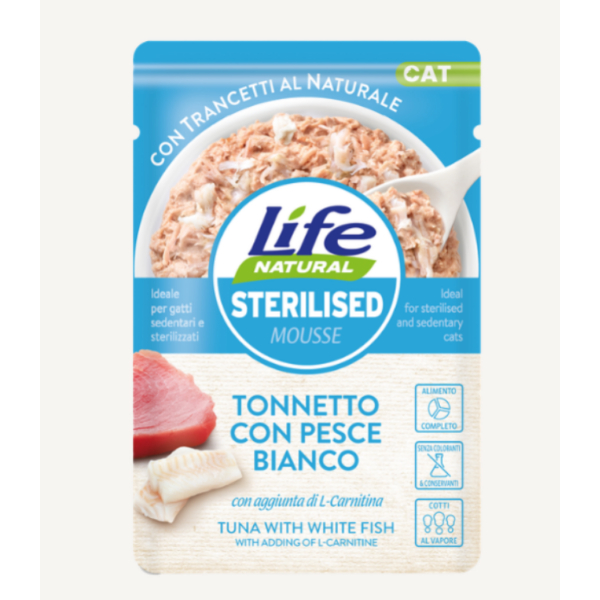 Cibo umido in mousse Life Natural per gatto sterilizzato con trancetti di tonnetto e pesce bianco. Ideale per gatti sedentari . Bustina da 70 gr
