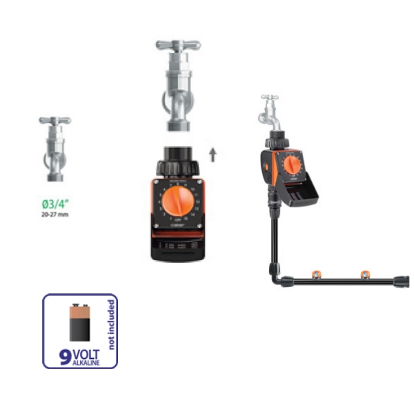 Programmatore automatico a una via assolutamente rivoluzionario. 15 programmi prefissati. Esclusivo monocomando a manopola rotativa per l’impostazione dei programmi desiderati. Si programma in un secondo: è sufficiente girare la manopola e scegliere una delle 15 tacche numerate. Tutti i programmi selezionabili sono riassunti in uno schema applicato sul coperchio. Dotato di filtro lavabile. Attacco rubinetto 3/4” (20-27 mm). Funziona con una batteria alcalina da 9 V sufficiente per l’intera stagione. Parte elettronica resistente alla pioggia e all’umidità. Pressione di esercizio da 0,5 a 10 bar. Controllato e testato al 100%.