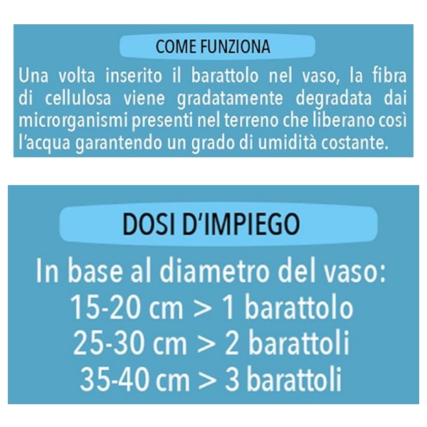 Riduce la frequenza delle annaffiature garantendo fino a 30 giorni di autonomia alle piante. Utilizzabile tutto l’anno, è ideale per periodi di assenza da casa. Inserito nel vaso viene progressivamente degradato dai microrganismi presenti nel terriccio che lo trasformano in acqua, garantendo un grado di umidità costante.