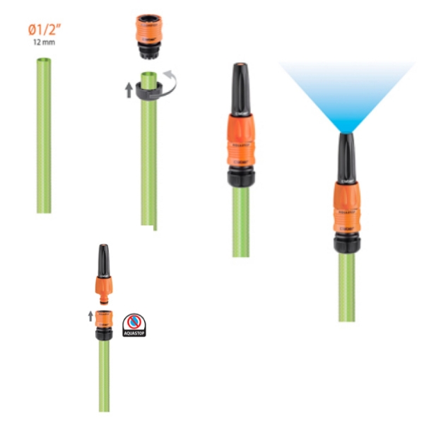 Automatico con aquastop per tubi da Ø 1/2” (12,5 mm). Si monta alla fine del tubo. Scollegando l'accessorio, il flusso d’acqua si blocca.