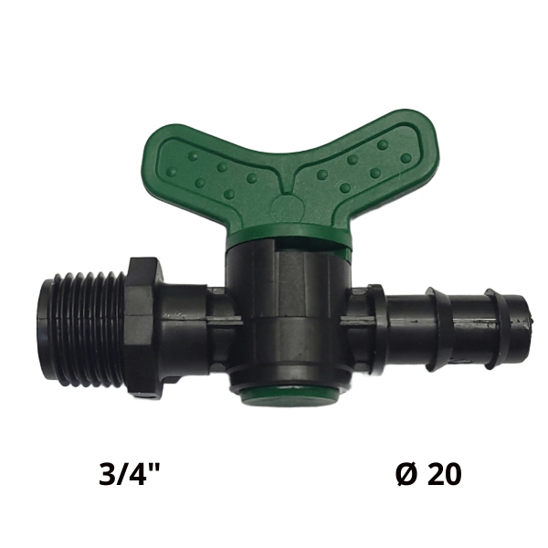 Rubinetto per Irrigazione con Attacco Filettato e Portagomma - Ø20 mm x 3/4" M Rubinetto in plastica resistente progettato per impianti di irrigazione a goccia e microirrigazione.