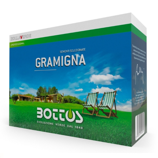 Gramigna è un prodotto Bottos della linea ZOLLAVERDE, composto da 100% di Gramigna (Cynodon Dactylon). Questo tipo di semente sviluppa un prato compatto, resistente al calpestio e a periodi di siccità prolungati: è ideale infatti per semine in zone esposte a sud e per aree mediterranee, ma anche a nord, purché sia presente un clima mite (zone lacustri) o a forte esposizione solare. Durante l'inverno, o con temperature molto basse, la gramigna va in dormienza, provocando l'ingiallimento del manto erboso. Gramigna è il prodotto ideale anche per i non professionisti che vogliano ottenere un prato comunque pregiato e di buona qualità estetica.