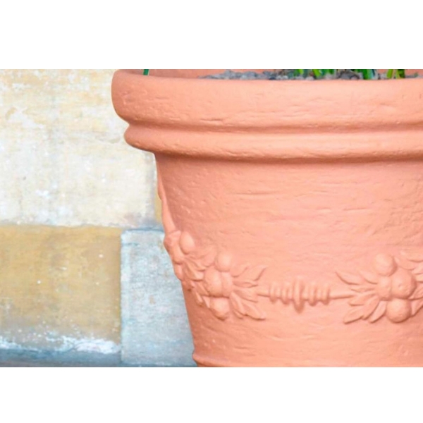Vaso in resina decorato dalla linea classica. Proposto in due colorazioni, terracotta e bianco, e diversi litraggi. Leggero, pratico e resistente.