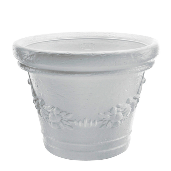 Vaso in resina decorato dalla linea classica. Proposto in due colorazioni, terracotta e bianco, e diversi litraggi. Leggero, pratico e resistente.
